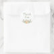 O adesivo de casamento bonito, moderno e simples apresenta spray floral de fundo com flores brancas e cor de pêssego, cor de água e folhas verdes sortidas e de eucalipto.