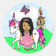 Adoráveis adesivos temáticos de conto de fadas com pequena princesa hispânica, afro-americana ou bi-racial e seu bonito unicórnio e castelo arco-íris com uma borboleta branca.