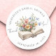 A sweet and elegant round sticker inspired by the “A New Chapter Begins” theme, perfect for baby or bridal showers. The center features “Thank You” in a handwritten script, with one word placed on each side of a watercolor illustration of an open vintage book. Delicate wildflowers bloom from inside the book in a soft mix of blush pink, yellow, periwinkle blue, and subtle hints of orange red for a warm, whimsical look.