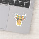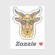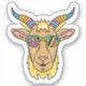 Um adesivo de cabeça de cabra branca e na moda, com uma cabra estilizada de desenho animado com um sorriso malicioso. A cabra tem um par de óculos de sol retrorreflectores e tem uma fita colorida, com vários padrões. A design geral é atraente e divertida, perfeita para decorar notebooks, laptop ou outros itens pessoais.