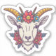 Um adesivo lúgubre e vibrante da cabeça de cabra, com um sorriso malicioso e olhos brilhantes. A cabeça é enfeitada com uma coroa floral colorida, e a design geral exude uma vibração alegre e caprichosa. É perfeito para adicionar um toque de diversão e criatividade a qualquer superfície, seja um laptop, notebook ou até mesmo uma parede.