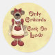 "Só Cozinhem Covardes em Baixo!" Engraçado dizer para cozinheiros de passatempo ou cozinheiros de profissão. Rico wordart, e uma linda mãe de urso vestindo um vestido vermelho com um avental e carregando as ferramentas de seu ofício. Um design humorístico para o seu cozinheiro favorito!