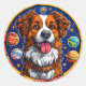 Cachorro alegre com pelo marrom e branco, proeminentemente colocado contra um fundo vibrante do espaço sideral. O cão está centrado em uma moldura circular decorada com planetas coloridos, estrelas e outros elementos celestes. Sua língua está para fora e tem uma expressão feliz, dando-lhe uma personalidade brincalhona. A combinação do cão e do tema cósmico cria uma atmosfera caprichosa e imaginativa. As cores são ousadas e brilhantes, realçando a vibração geral alegre da ilustração.