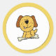 Cãozinho de desenho animado doce com osso sobre fundo branco com borda amarela