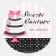 © 2012 Designs socialitas. Nossas focas/adesivos de padaria de bolo de couture têm um bolo elegante com arco, flores e espirais. O fundo tem um padrão listrado sutil e pontos de polca preto e branco. O padrão de bolo e poka-dot pode ser redimensionado e movido para se adequar às informações de sua empresa.