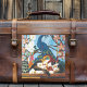 O gato Calico brincando com um dragão chinês vermelho em frente a uma janela de vidro colorido de pavão.