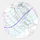 Caminho do eclipse solar total de 8 de abril de 2024 representado em um mapa global da NASA que mostra os tempos do trânsito e o ponto do maior eclipse. Note que o caminho estreito da totalidade para a América do Norte começa na fronteira do Pacífico do México e viagens Nordeste através do Texas e do Centro-Oeste, saindo na fronteira atlântica do Maine.