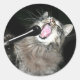 É noite de karaokê no beco local e esta tábua de cinza por gato pega o microfone e salta de cozinha, serenando a plateia ou talvez cantando para seu autocolante de fotos