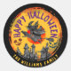 Celebrar o Dia das Bruxas com amigos e familiares, à medida que oferece favoritos para festas ou obrigados, você oferece presentes ou convites selados com esses adesivos legal e festivos do "Feliz Dia das Bruxas". Estes adesivos assustadores para a festa do Dia das Bruxas mostram uma bruxa voando sobre uma vassoura com um castelo assustador abaixo contra um fundo preto e laranja. Texto em roxo diz "FELIZ MALHEIRA". Personalize abaixo com o nome de sua escolha.