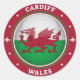 Uma representação em 3D da bandeira nacional galesa, sentada no meio da design A capital, Cardiff, está no topo da imagem, e o país, País de Gales, está no fundo da imagem. Entre as duas partes do texto estão estrelas decorativas e duas pulgas de lista.