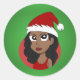 Design com uma ilustração da linda jovem africana americana de cabelo ondulado e chapéu de Papai Noel, design de Natal com fundo verde, por Radka Kavalcova