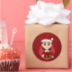 Design com uma ilustração de uma menina feliz sorridente com cabelo preto curto, ela está vestindo fantasia de Papai Noel vermelho e branco e segurando um presente; design de Natal com fundo vermelho
