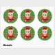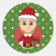 Design com uma ilustração de uma menina feliz sorridente com cabelo loiro curto, ela está vestindo a fantasia vermelha e branca do Papai Noel e segurando um presente; design de Natal com um fundo verde sem soldadura com estrelas