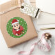 Design com uma ilustração de uma menina feliz sorridente com cabelo preto curto, ela está vestindo fantasia de Papai Noel vermelho e branco e segurando um presente; design de Natal com um fundo verde sem soldadura com estrelas