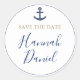 Este casamento náutico personalizado único salve o modelo do adesivo de data round com uma âncora e seus detalhes em azul marinho e ouro. A âncora não é uniformemente colorida, o que empresta um aspecto quente, curado e sabor feito à mão que nos lembra um impressão de bloco de madeira ou uma escultura de madeira. Na verdade, a ilustração que inspirou esta design foi originalmente feita com um simples carimbo, que é responsável pelo seu encanto. Você pode mudar 'salvar a data' para 'salvar nossa data' ou algo diferente de sua escolha. Você pode alterar o estilo e a cor de qualquer um dos textos. Escolhemos uma configuração padrão de um estilo de script flexível e flexível para as preferencialmentes. Mas há muitas outras fontes nas ferramentas de edição, incluindo muitos scripts diferentes, por isso experimente e você encontrará um script ou outra fonte que se adapte ao seu estilo. Escolhemos uma sombra de azul marinho profundo que às vezes é chamada de safira escura (cor hex #082567) para a fronteira, âncora e seus nomes, e um ouro elegante chamado Califórnia Dourada (cor hex #A98F64) para o texto 'salvar a data'. Se você preferir uma cor ou cores diferentes, você pode alterar isso. A cor da âncora, no entanto, não pode ser alterada. Crie sua própria aparência personalizada com as ferramentas intuitivas de design e sua inspiração!