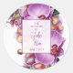 As orquídeas fornecem um pano de fundo decorativo para esses adesivos redondos clássicos do casamento. Excelente para eventos climáticos quentes, casamentos, aniversários, ao ar livre, dentro. Utilização para complementar temas de eventos de casamento florais, incluindo temas tropicais. Adicione facilmente seus detalhes. Use a modelo para personalizar.