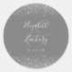 Este elegante e moderno adesivo de casamento apresenta um falso design brilhante prateado na borda superior e inferior. Personalize facilmente o texto da cinza prateada em um fundo de cinza médio, com os nomes da noiva e do noivo em caligrafia manuscrita sobre um grande painel.
