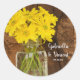 Personalize esses encantadores selos de casamentos de casamentos de marcenos de marcenos e margaridas com nomes pessoais de noiva e noivo e data específica de cerimônia de casamento. Estes adesivos casuais, porém clássicos, rústicos e costurados nuptiais cômicos apresentam uma fotografia floral quintal melhorada digitalmente de um frasco de latas de vidro cheio de flores margaridas amarelas e de um fundo de madeira de celeiro de castanho.