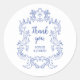 Estes elegantes e luxuosos adesivos de casamento apresentam uma estrutura de arte de vintage com estilo barroco ornamentado. O design é azul sobre fundo branco. A caligrafia moderna que diz "obrigado-te", e o texto clássico com os teus nomes, fazem disto uma escolha moderna, ainda que atualizada, para o teu casamento.