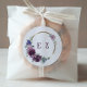 Design botânico com uma coroa de bolso de flores de aquarela púrpura numa estrutura circular dourada. Personalize-o com as iniciais do monograma da noiva e do noivo em roxo escuro.