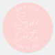 Decorar o seu casamento Guarde os envelopes de Data com estes adesivos redondos que apresentam uma cor rosa pincelada e um roteiro branco e estilizado. Personalize seus adesivos substituindo nomes de noivas e noivos e data de casamento por seus. Selecione entre um estilo mate ou brilhante.