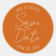 Decorar o seu casamento Guarde os envelopes de Data com estes adesivos redondos que apresentam uma cor laranja queimada e um guião branco e estilizado. Personalize seus adesivos substituindo nomes de noivas e noivos e data de casamento por seus. Selecione entre um estilo mate ou brilhante.