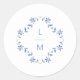 Chic com elegância jovem. Este adesivo de casamento azul e branco, empoeirado, exumenta um tom fresco, moderno e jovem. O design apresenta um adorável monograma elegante de casal floral, contra um fundo branco nítido. Correspondência perfeita para todos os outros itens na coleção.