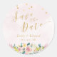 Casamento personalizado salve os adesivos de data/etiquetas com design de caligrafia dourada com buquê rosa elegante. Personalize com o nome e a data da noiva e do noivo.