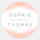 Este adesivo de casamento moderno apresenta um design geométrico em camadas de pêssego com os nomes do casal de casamento. Veja outros itens de casamento correspondentes https://www.zazzle.com/collections/peach_layered_geometric_light_sage_wedding-119919264900833968?rf=238364477188679314&tc=rc. Personalize-o substituindo o texto do marcador de posição. Para obter mais opções, como alterar a fonte, seu tamanho e espaçamento entre letras, clique no botão "Personalizar". *Observe que a Marca d'água do Zazzle que aparece na visualização de zoom NÃO aparecerá no produto impresso final. © Rosewood e Citrus