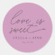 simples rótulo adesivo de favor de casamento em letra minúscula moderna "o amor é doce" cor de rosa empoeirado.