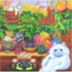 Sticker com a pintura de animais de Louis Wain Master of Cat College (1860-1939). Um gato branco pensativo com olhos azuis impressionantes senta-se pesadamente ao lado de uma variedade vibrante de flores bonitas. A majestosa faculdade de gatos venta no fundo sob um céu rosa e azul. Um presente maravilhoso para amantes de gatos e arte inglesa.