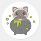 Feliz Dia das Bruxas O gato com caldeirão de Halloween. Animais engraçados no caldeirão com morcegos. Uma fantasia divertida de Halloween para bebês e crianças que amam gatos.