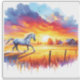 Um cavalo em greve rolava graciosamente através de um campo vívido de aquarela no pôr do sol. As tons quentes do céu laranja e rosa contrastam com o cenário rural de uma fazenda e uma cerca rústica, criando uma atmosfera pitoresca e serena.