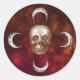 Gótico Magik, ilustração vintage do crânio com quatro luas de crista prateada sobre fundo celeste vermelho.