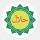 Este adesivo é uma marca de certificação islâmica que indica que o produto ao qual está afixado é Halal, o que significa que adere às leis alimentares islâmicas. A palavra "Halal" ou "حلال" é escrita tanto em árabe quanto em inglês. Este adesivo pode ser usado em embalagens de alimentos, recipientes e rótulos para significar que o produto é permitido para consumo por muçulmanos.