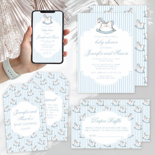 Descubra nosso fascinante sortido de chá de bebê personalizado, perfeito para adicionar uma dica de fidelidade pré-disquete a seu evento. Apresentando deliciosas listras azuis pastéis e um adorável brinquedo de cavalo de balanço de madeira, esses adesivos são feitos para encantar seus convidados e melhorar o apelo visual de sua celebração.