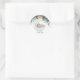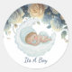 Menino bebê convite de chá de bebê adesivo redondo perfeito para dar as boas-vindas ao seu pequeno príncipe. Este design apresenta uma delicada ilustração em aquarela de um menino bebê descansando em uma nuvem macia e fofa, emoldurada por um arranjo exuberante de rosas azul meia-noite e dourado champanhe.