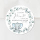 Um adesivo bonito para os convites para chás do seu bebê, obrigado cartões e favoritos para festas com "Um Doce Pequeno Pêanut Está a Caminho" numa mistura de simples tipografia e um roteiro de na moda com um inchaço cardíaco e uma aquarela de um elefante bebê azul numa coroa verde de eucalipto verde sábio. Personalize com o nome da futura mãe e a data do chá.
