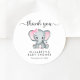 Os adesivos bonitos para o chá de sua menina favorece e corresponde a "Obrigado" escrito em um roteiro de na moda swash e uma aquarela cor rosa pastel de um elefante bebê. Personalize o nome da futura mãe e a data do chá em uma simples tipografia de cinza.