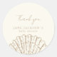 Adesivo redondo de chá de bebê concha elegante com fundo cor creme e texto cor bege em caligrafia e tipografia elegantes. Acompanhado por uma ilustração de concha.