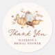 Adicione um toque quente e elegante à sua celebração com esses adesivos para chá de panela de outono, apresentando abóboras em aquarela, flores de outono e folhagens aconchegantes em tons terrosos ricos. "Obrigado" é exibido em uma escrita à mão marrom, com o nome da noiva mostrado logo abaixo em um fundo de creme suave. Perfeitos para selar envelopes, decorar sacolas de lembranças ou adicionar um acento sazonal à decoração do seu evento, esses adesivos personalizados são ideais para chás de panela de outono, chás de bebê ou qualquer reunião com tema de outono.