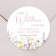 Um adesivo elegante e caprichoso para os convites do chá de bebê, cartões de agradecimento e lembrancinhas com a frase "uma pequena flor silvestre está a caminho" escrita em uma mistura de tipografia cinza moderna e uma caligrafia rosa estilosa, e aquarelas inspiradas em boho com flores silvestres delicadas em roxo, rosa e amarelo. Adicione o nome da futura mãe em letras rosas simples.
