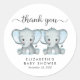 Os adesivos bonitos para os seus bebês gêmeos, chás favores e correspondência com "Obrigado", escritos em na moda com balsas e aquarelas azuis pastéis de elefantes bebês. Personalize o nome da futura mãe e a data do chá em uma simples tipografia de cinza.