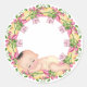Chá de fraldas amarelo e cor-de-rosa com Baby deitado no fundo da coroa floral