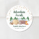 Os adesivos bonitos para sua correspondência de chá de fraldas e favoritos para festas com ilustração aquática de animais da floresta com sua tenda acampando nas montanhas e na floresta, uma camada de estrelas de ouro, e "Aventura Aguarda" e o nome da futura mãe em um roteiro verde da floresta.