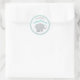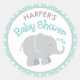 Na moda e adesivo de favoritos de chá de fraldas doce apresentam texto personalizado que pode ser personalizado com o nome da mãe e um adorável bezerro de elefante recém-nascido com placas em forma de coração. A design redonda inclui um padrão de bolinhas e inclui um esquema de cor do azul aqua, cinza e branco, neutro em termos de gênero.