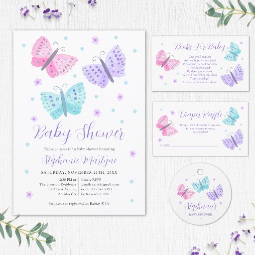 Estes chás de fraldas apresentam um belo design de borboleta aquosa branca com borboletas roxas, cor-de-rosa e aqua, flores e pontos confetti. Outros itens de chá de fraldas correspondentes também estão disponíveis. Consulte a página de coleta ou visite nossa loja para ver a faixa de cheios dos produtos com este design.