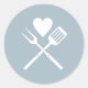 Um adesivo azul-claro redondo moderno com utensílios de CHURRASCO e um coração, combinando os Convites BABY-Q para um CHURRASCO de Chá de fraldas no meu compro. Use este adesivo para selar envelopes ou favorecer as bolsas.
