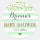 adesivos redondos de chá de fraldas com faixas brancas e verdes de menta e brilho de faux confetti. Excelente para um chá de fraldas neutro em termos de gênero! Conclua o seu tema com convite, sinais, decorações e muito mais da nossa Coleção de Confetti Dourada e Verde da Casa da Casa da Moeda.