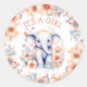 É uma garota! Um doce elefante bebê rodeado por flores cor-de-rosa e coral ilustra aquarela com adesivos personalizados de chá de fraldas para uma menina.
